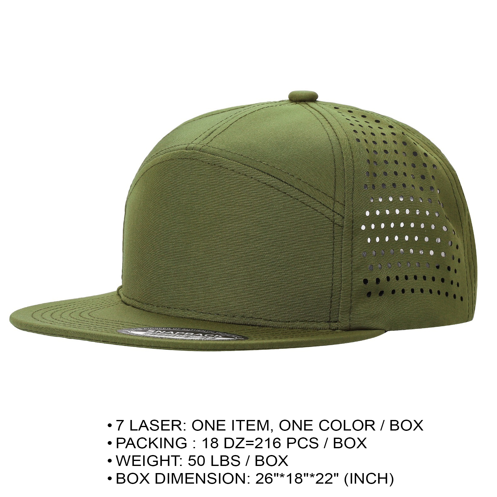 A 7-panel laser-vented cap is a type of hat known for its design that incorporates six distinct panels on the front portion, with laser-vented features for enhanced breathability. Here's a detailed description: